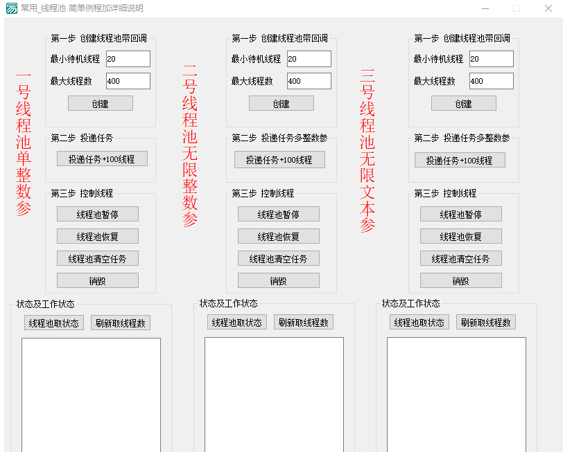 re = 线程池1.创建 (&任务_单参, &回调函数, 待机数, 最大数) '线程工作完。返回结束到回调函数